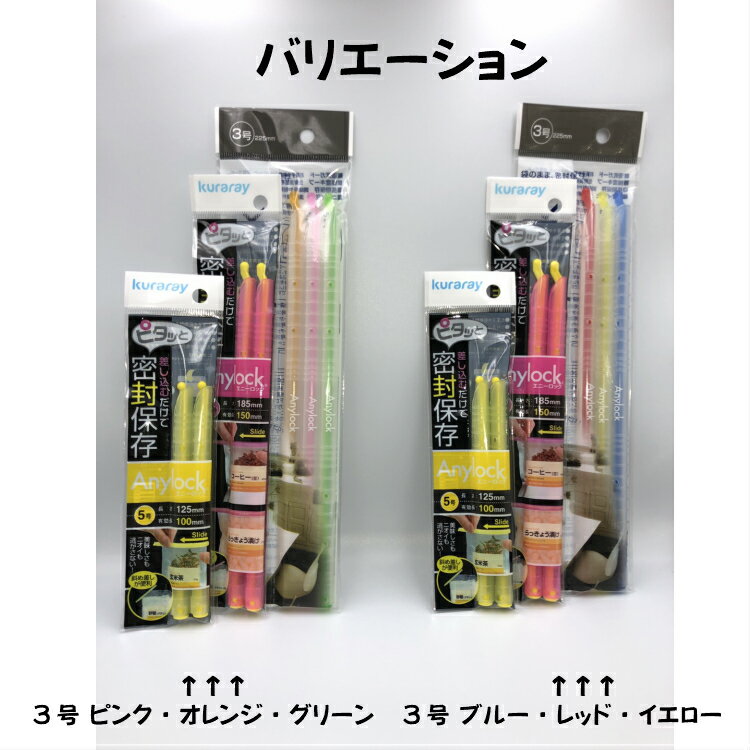 ●セット内容● 3号(225mm)選べる ブルー・レッド・イエロー ピンク・オレンジ・グリーン ・・・3本 4号(185mm)ピンク・・・2本 5号(125mm)イエロー・・・2本 ●特徴● お菓子や乾物類をパリッと湿気ガード 生鮮食品をフレッシュに鮮度キープ 調味料や粉類を衛生的に長期保存 冷蔵庫・冷凍庫でもスッキリ収納 ●ご使用方法● ・開いている袋の口を折り中の空気を抜いてシワができないように水平にたたんでください。